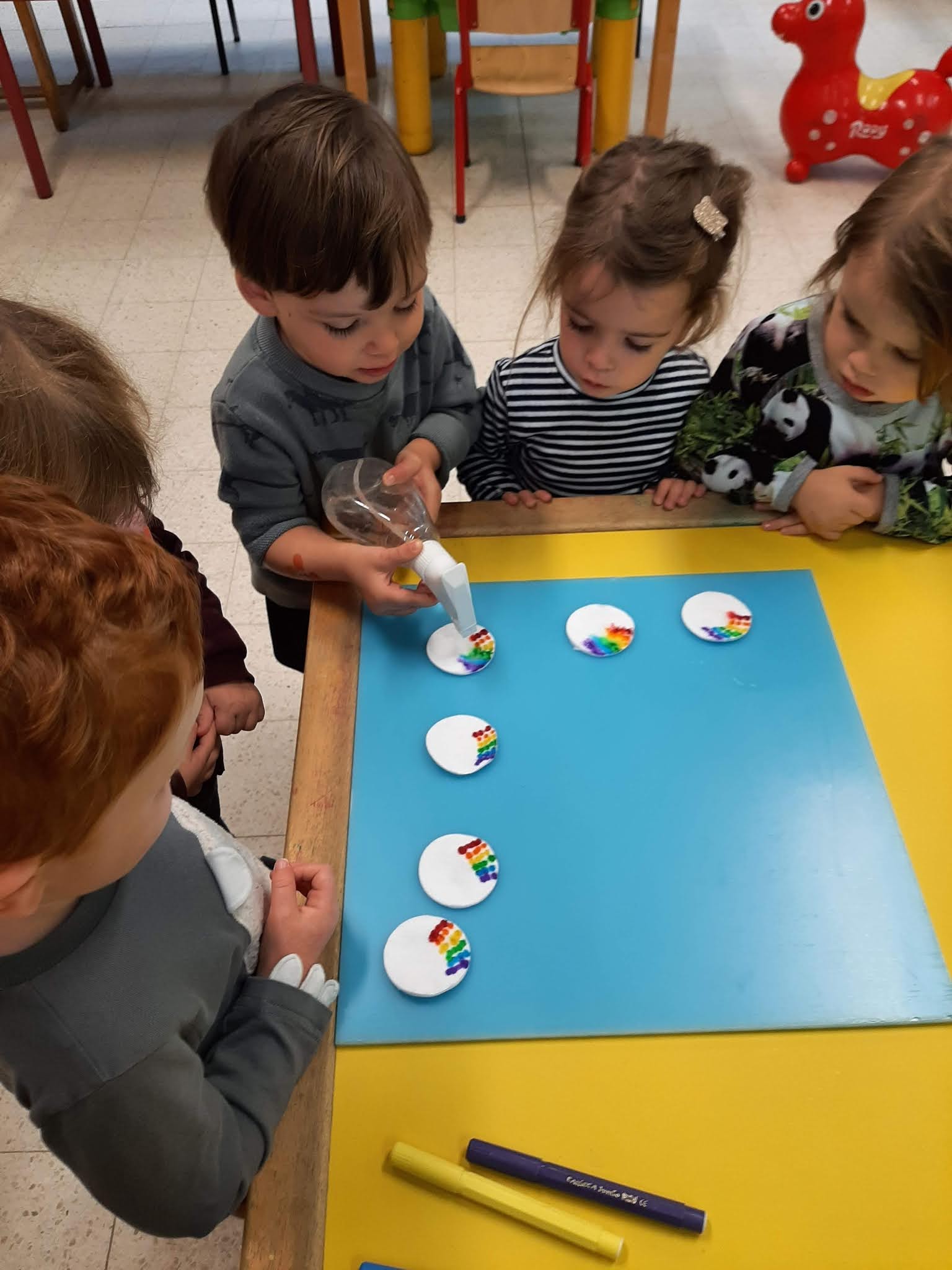 Met water spoten we op een watje met stift en dat werd een mooi wit visje met kleuren van de regenboog. Op mama vis mochten we met dotters de kleuren stempelen.